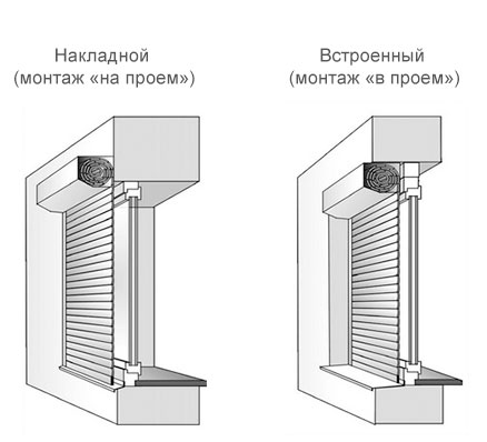 Существует два основных вида монтажа защитных роллетов. Монтаж Накладной и Монтаж Встроенный в проем стены.
